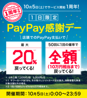 10月5日には、サービス開始1周年を記念した「PayPay感謝デー」を開催。PayPay決済(「Yahoo!JAPANカード」以外のクレジットカード支払いを除く)をすると最大で支払金額の20%相当のPayPayボーナスを付与する。条件が少なく、対象店舗が多く、還元率が高い、消費者にとっては最もうれしいキャンペーンといえるだろう。