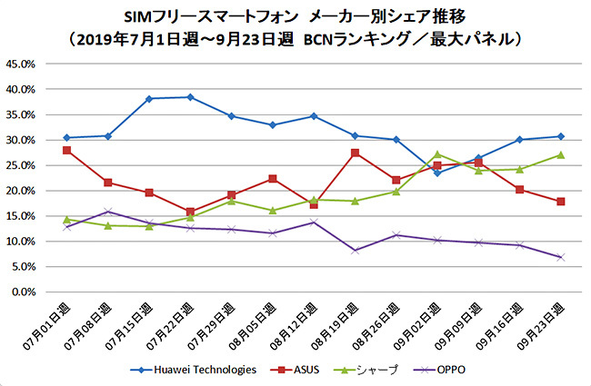 全国の家電量販店やECショップでPOSデータを集計する「BCNランキング」によると、9月のSIMフリースマートフォンの販売台数前年同月比は127.2%だった。増税前の駆け込みによって、デジタル家電で200%を超えるカテゴリーも多かったことを考慮すると、伸び率は大きくなかった。大きくシェアを伸ばしたのは242.0%を記録したシャープだったが、米中貿易摩擦の影響でシェアを大きく落としていたファーウェイが95.5%と前年並みに戻しており、ようやく回復の兆しが見え始めた。