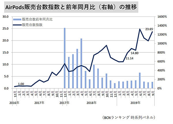 AirPodsの最初の発表は16年9月。イヤホンジャックを廃止した「iPhone 7」とともにデビューした。国内では同年12月13日に発売(店頭販売は12月19日から)、今年12月で丸3年目を迎える。発売翌月の17年1月のAirPodsの販売台数を1とすると、17年10月が5.43、18年10月が17.95と順調に拡大。発売直後は品薄が続き、入手困難だったが、17年5月以降、潤沢に入荷し始め、売れ行きが加速した。直近の19年9月は、消費増税前の駆け込みも重なり、販売台数指数が23.65を記録。完全ワイヤレスイヤホン新規参入後、最多の水準だった。