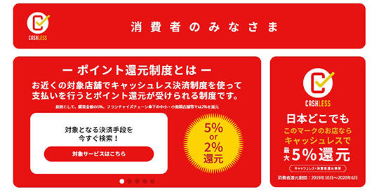 ご存じだとは思うが、改めて。キャッシュレス・ポイント還元事業とは、政府主導によるポイント還元事業だ。消費増税に伴う消費活動の低迷をカバーする目的があり、期間中、対象店舗でのキャッシュレス決済利用で5%もしくは2%のポイント還元を受けることができる。キャッシュレス決済自体の普及も目的の一つとなっている。
