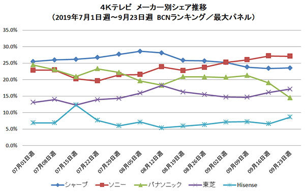 9月週次の販売台数シェア推移では、第1週にソニーが0.1ポイント差で首位に立ち、右肩上がりにシェアを伸ばした。パナソニックは後半にかけて失速。代わりに東芝とハイセンスが追い上げ、東芝は最終週でパナソニックを上回り、3位に浮上した。
