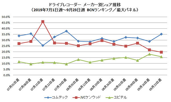 メーカー別で伸び率が最も高かったのは、前年比245.5%を記録したJVCケンウッド。9月週次のメーカー別販売台数シェアの推移では、前半こそコムテックとJVCケンウッドが競り合ったが、後半はコムテックが突き抜けた。3位のユピテルはじわじわとシェアを上げ、第4週にJVCケンウッドとの差を3.9ポイントに縮めた。