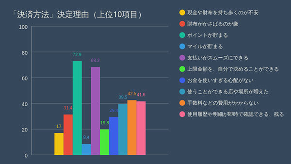 調査対象者に、クレジットカード/電子マネー/スマートフォン(スマホ)決済/デビットカードなど各種キャッシュレス決済のうち、過去1年間で最も多く利用した決済方法と、その決済方法を選んだ理由を複数回答可で尋ねたところ、1位は「ポイントが貯まる」(72.9%)で、「支払いがスムーズにできる」(68.3%)や「手数料などの費用がかからない」(42.5%)を上回った。