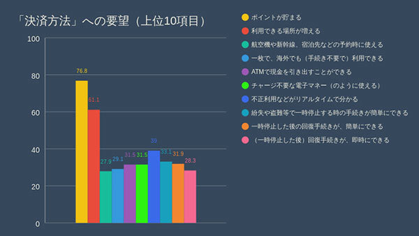 利用頻度の高い決済方法について、どんな機能やサービスが欲しいかを尋ねた質問でも、「ポイントが貯まる」が76.8%で最も多く、次いで「利用できる場所が増える」「不正利用などがリアルタイムでわかる」と続いた。