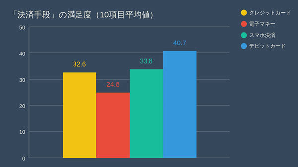 さらに、利用頻度が高い決済方法について、「契約手続き」「サービス利用開始時間」「利用可能店舗・サービス」「決済手続き」「利用上限」「残高・利用金額の分かりやすさ」「セキュリティ面」「紛失・盗難時リスクの低さ」「紛失・盗難時の停止手続き簡便さ」「停止手続きから再度使用の簡便さ」の10項目の平均値を比較した結果、デビットカードが40.7、スマホ決済が33.8、クレジットカードが32.6、電子マネーが24.8となり、利用者の満足度はデビットカードが最も高かった。