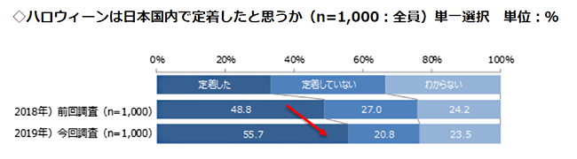 「ハロウィンが日本に定着したと思うか」という設問には、55.7%が「定着した」と回答。昨年に実施した調査よりも約7ポイント高かった。「ハロウィンに実施すること」については、「特に何もする予定はない」が71.6%でトップ。「自分以外(子どもなど)を仮装させる」(7.4%)、「自宅にハロウィンの装飾を行う」(7.0%)が続いた。