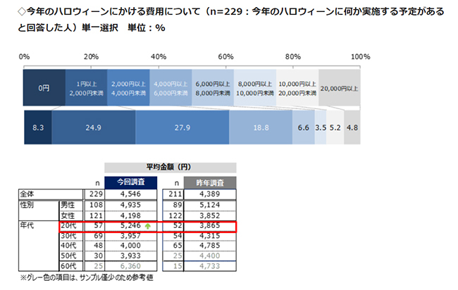 ハロウィンに何か実施する予定がある人に「予算」を聞いたところ、「2000円以上4000円未満」(27.9%)と回答した人が多かった。次いで「1円以上2000円未満」(24.9%)、「4000円以上6000円未満」(18.8%)となり、平均予算は4546円。昨年比で157円増加した。