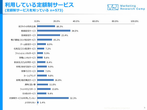 定額制サービスの利用者に、現在、利用中の定額制サービスを聞いたところ(複数回答)、「動画配信サービス」を挙げた人が最も多く(34.0%)、次いで「音楽配信サービス」(23.4%)、「ECサイトの有料会員」(18.3%)、「新聞・雑誌購読サービス」(16.8%)、「電子書籍・コミック配信サービス」(15.2%)だったという。