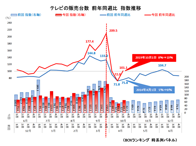 消費税率が8%から10%になった10月1日以降、209.5%のピークから2週間で72.0%まで急落したテレビ市場だが、10月第3週は前年トントンまで回復。見た目通りのV字回復になった。前回増税時の14年4月第3週が75.8%と、ゆるやかに回復していったのとは明らかに異なる。