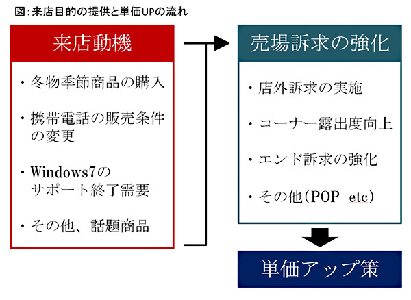 暖房器具のような来店のキッカケを促すことができる商品は他にもあり、(1)すでに需要の出ているWindows 7サポート終了、(2)携帯電話の販売条件変更による不安と情報収集、(3)任天堂の小型端末ゲームのNintendo Switch Lite――などが有力な商品だ。POPや装飾をインパクトあるものにするとともに、店外でも訴求することで来店客の流入も期待できる。
