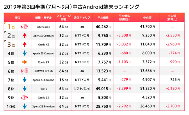 中古Androidスマホランキングでは、前回のランキング圏外から約300%増で取引数を伸ばしたのは、Xperia XZ3(au)だった。Xperia 1の発売に伴い、auオンラインショップで過去モデルの大幅な値下げが行われた結果、定価の6割程度で購入したXperia XZ3が中古市場に影響を与えたと考えられるという。