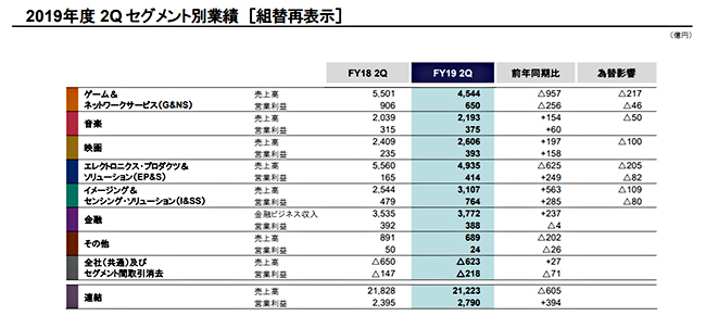 2Q単独のセグメント別売上高で見ると、ゲーム&ネットワークサービス分野の4544億円(17%減)とエレクトロニクス・プロダクツ&ソリューション分野の4935億円(11%減)の大幅な減収を、イメージング&センシング・ソリューション分野の3107億円(22%増)の増収が補っている。