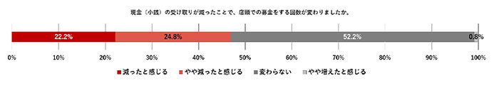 およそ2人に1人が「店頭でもらった小銭などのお釣りを募金箱に入れた経験がある」と回答したが、キャッシュレス化によって「現金(小銭)の受け取りが減ったことで店頭募金の回数が減った」が47%という。これまでは、会計の次いでにという参加のしやすさで店頭募金を選択していたとのことだ。