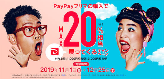 PayPayフリマでは、購入金額の最大20%を還元するキャンペーンを実施。付与上限は1回当たり1000円相当、1カ月当たり3000円相当。期間は12月25日まで。同サービスでは、10月30日まで出品者の送料が無料になるキャンペーンも実施している。