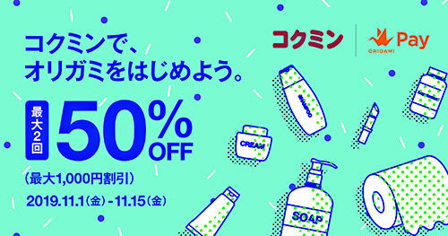 10月16日からコクミンの運営する「コクミンドラッグ」に対応したOrigami Payは、11月1~15日の期間で、50%オフクーポンを配信。Origami Payを初めて利用する場合が最大1000円割引のクーポンを2度、すでに利用したことがある場合がコクミンで初めて支払うと1度クーポンを取得できる。