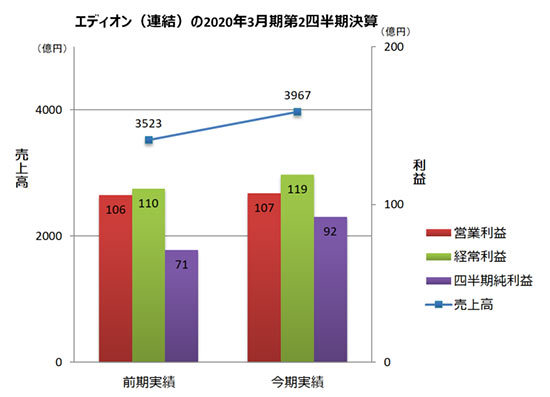 エディオンの2020年3月期第2四半期(4~9月)における連結決算は、今年6月の大阪・難波での「エディオンなんば本店」オープンと広島市での「エディオン広島本店」建て替えオープンなどで、売上高が3967億円(前年同期比12.6%増)の大幅な増収となった。営業利益が107億円(1.2%増)、経常利益が119億円(7.7%増)、親会社に帰属する四半期純利益が92億円(29.9%増)の増益だった。