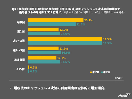 10月1日の消費増税導入を境に、その前後で消費者のキャッシュレス決済の利用はどう変化したのか。スマートフォン(スマホ)アプリ紹介サービス「Appliv(アプリヴ)」を運営するナイルが、10月11~18日の期間に実施したアンケート調査によると、増税前よりも増税後の方が増えていることが分かった。