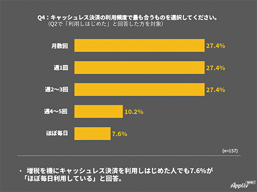 また、10月1日の「増税を機にキャッシュレス決済を利用しはじめた」と回答した157人に絞って聞いた利用頻度では、月数回と週1回、週2~3回がいずれも27.4%の同数だった。10月に使い始めた人でも10.2%が「週4~5回」、7.6%が「ほぼ毎日」と回答した。