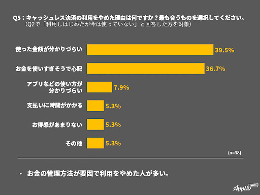 「アプリなどの使い方が分かりづらい」が7.9%と低かったことからも、UIなどの使い勝手はいいが、どれだけ使ったかなどトータル金額を把握しやすくしたり、分かりやすく表示したりするなどの課題がありそうだ。同じ調査のほかの項目については、過去の記事を参考にしてほしい。