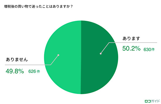 「増税後の普段の買い物で迷った経験はありますか?」との質問に対して、「あります」が50.2%、「ありません」が49.8%。軽減税率制度による税率の違いや、多種多様な決済方法、決済方法や店舗によって異なるポイント還元制度など、複雑な実態に迷う生活者の様子が見て取れるという。
