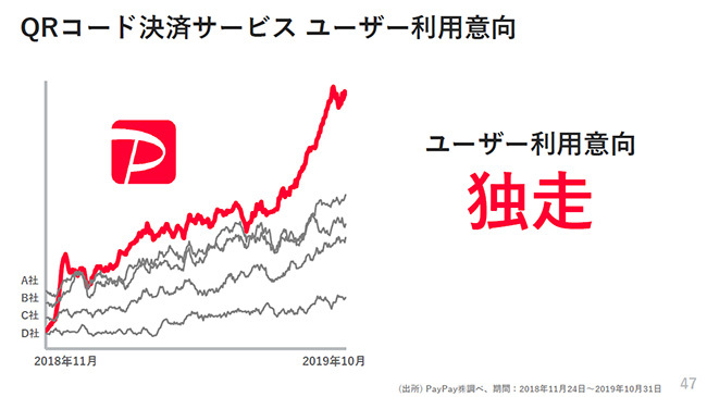 PayPayが行った調査によると、QRコードサービスのユーザー利用意向では、PayPayがトップを独走状態。現金以外で思い浮かぶキャッシュレス決済手段としても、クレジットカード以外でトップに立っている。宮内社長は、「10月1日の消費税増税に際して実施されている2%もしくは5%の還元がある国のポイント還元事業の影響があるかもしれない」と分析する。