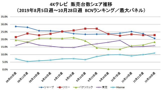 メーカー各社の状況を分析すると、9月は上位5社が前年比を大きく上回ったが、10月は勢いに差が出た。販売台数シェアで1位のシャープ(91.3%)と3位のパナソニック(97.2%)は若干の前年割れ。2位のソニー(101.1%)は微増。4位の東芝(132.5%)と5位のハイセンス(142.3%)は大幅に販売台数を伸ばした。
