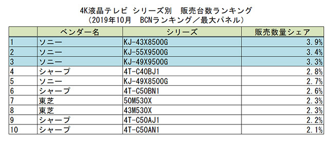 シリーズ別では、9月にトップ3を独占したソニーが順位をキープ。「KJ-43X8500G」「KJ-55X9500G」「KJ-49X9500G」の順で並ぶ。ただ、後続とのシェア差は縮まり、1~10位までの差は1.8%しかない混戦。東京五輪効果で例年以上の盛り上がりが期待される年末商戦を前に、各社のシェア争いが本格化してきている。(BCN・大蔵 大輔)