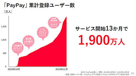 スマホ決済の火付け役といえるPayPayの累計登録ユーザーが1920万人を突破した。サービス開始からわずか13カ月、しかも8月からの3カ月間で倍増しているという。ソフトバンクの宮内謙社長も、この状況を“一人勝ち”と表現するほど、勢いは増している。