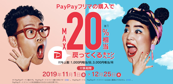 PayPayフリマのキャンペーンでは、購入金額の最大20%を還元するキャンペーンを実施。付与上限は、1回当たり1000円相当、1カ月当たり3000円相当。期間は12月25日まで。同サービスでは、10月30日まで出品者の送料が無料になるキャンペーンも実施している。