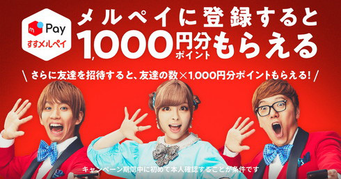 メルペイは友だちを招待すると1人招待につき1000ポイント付与する「友達招待キャンペーン すすメルペイ第2弾」を11月6日に開始。付与上限は、最大1億円相当。招待された側にも、1000円相当のポイントを付与する。終了日は未定。10万人が特別招待コード「MOTTAINAI」からメルペイに登録すると、きゃりーぱみゅぱみゅさんが新曲を披露するという企画も同時に実施している。