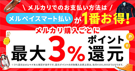 対象は、メルカリ内での出品アイテム購入。還元率は「お店でも使えるメルペイスマート払い」の設定が未完了で、キャンペーン期間中に支払い方法をメルペイスマート払いに設定して決済した場合は1%。お店でも使えるメルペイスマート払いの設定完了済みで、キャンペーン期間中に支払い方法をメルペイスマート払いに設定して決済した場合は3%。
