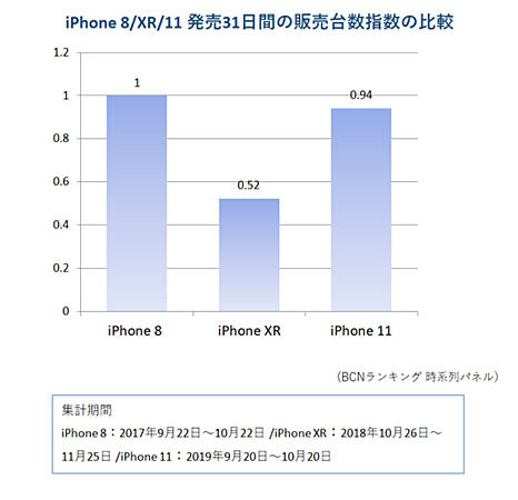 今年9月20日発売の新iPhone3機種のうち、最も安価な「iPhone 11(イレブン)」の売れ行きが好調だ。家電量販店の実売データを集計した「BCNランキング」によると、それぞれ発売から31日間の販売台数を比較すると、iPhone 11は、2年前の2017年発売の「iPhone 8」にはやや及ばないものの、18年発売の前機種「iPhone XR」の1.8倍と、初動は伸びている。上位機種の「iPhone 11 Pro」も、同期間のiPhone XRより売れており、実際に触って選べる、3機種一斉発売がプラスに働いたようだ。