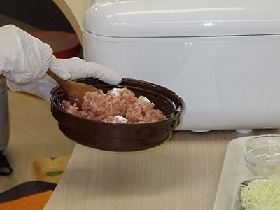 tacookで調理するときに使う「クッキングプレート」に肉だねと調味料を入れてよくかき混ぜる。混ぜ終わったら肉だねを平らにして、その上に千切りキャベツをのせる。