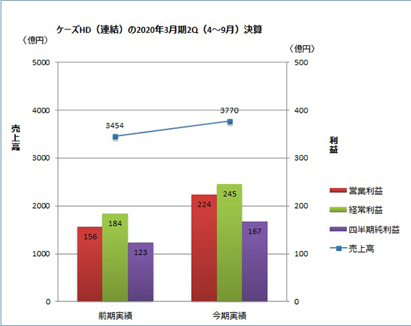 ケーズホールディングスの2020年3月期第2四半期(4~9月)決算は、7月における長梅雨の影響によるマイナス要因を上回る消費増税の駆け込み需要があり増収、大幅な増益を確保した。売上高が3770億円(前年同期比9.1%増)、営業利益が224億円(43.4%増)、経常利益が245億円(33.4%増)、親会社株主に帰属する四半期純利益が167億円(35.2%増)だった。