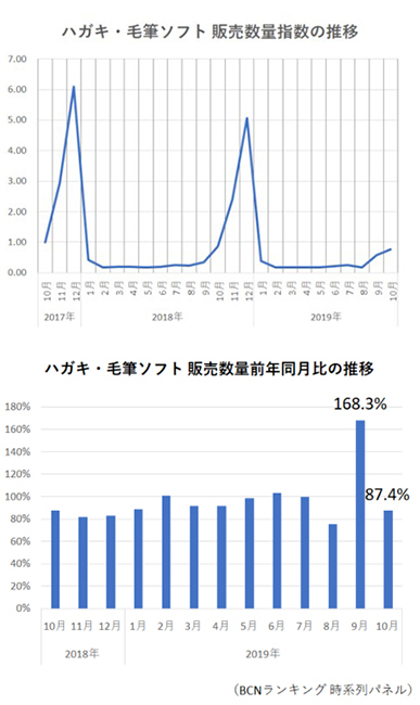 しかも、消費増税直前の今年9月は前年同月比168.3%と、何と前年超えを記録。はがきソフトは例年、11月・12月に売れ行きが高まることから、今年9月の高い伸びはまさに増税前の駆け込みの結果といえる。2000~3000円台のアイテムでもより安く、お得に手に入れたいという心理がうかがえる。