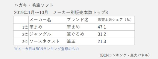19年1~10月の葉書・毛筆ソフトのメーカー別販売本数1位は、今年30周年を迎えた「筆まめ」シリーズの筆まめ。シェアは47.1%と、半数近くを占めた。2位の「筆ぐるめ」シリーズのジャンルグルが31.2%、3位の「筆王」のソースネクストが21.3%と、1位の筆まめにだいぶ離されている。今年の最新版は、それぞれ「筆まめ Ver.30」「筆ぐるめ 27」「筆王 Ver.24」。対象ユーザーや特典の違いなどによって異なるタイトル別で、19年10月は「筆まめ Ver.30 アップグレード・乗換版」がトップに立った。