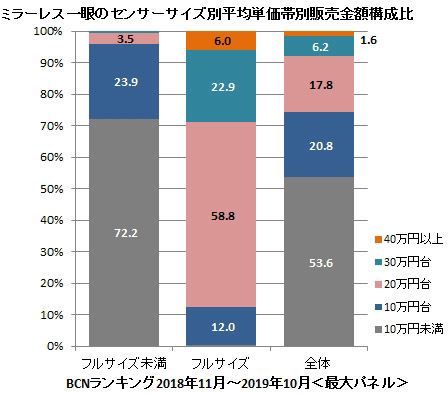 集計範囲をフルサイズのミラーレス一眼まで広げると、平均単価は22万8000円。20万円台の製品が売上高の58.8%を占め、中心的な価格帯になっている。一方、フルサイズ未満のミラーレス一眼は平均単価が7万5800円で、72.2%の売り上げを10万円未満の製品が占めている構図だ。