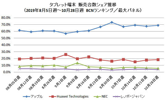 10月週次のメーカーシェア推移では、アップルが70%付近の高水準で推移。Android勢上位のファーウェイ・NEC・レノボもほぼ横ばいで現状のシェアをキープした。アップルほどの大きな伸長ではないが、NEC(104.8%)とレノボ(113.6%)も販売台数で前年を上回っている。