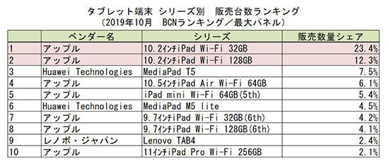 シリーズ別では9月30日に発売された「iPad 10.2インチ 第7世代 Wi-Fiモデル」がワンツーフィニッシュ。32GBモデルと128GBモデルを合わせたシェアで4割近くを占めた。手頃な価格で支持を集める新iPadは、Apple PencilやSmart Keyboardに対応したことで、よりノートPCライクに使えるようになった。PCの代わりにiPadを選択する消費者が増えている可能性もある。(BCN・大蔵 大輔)