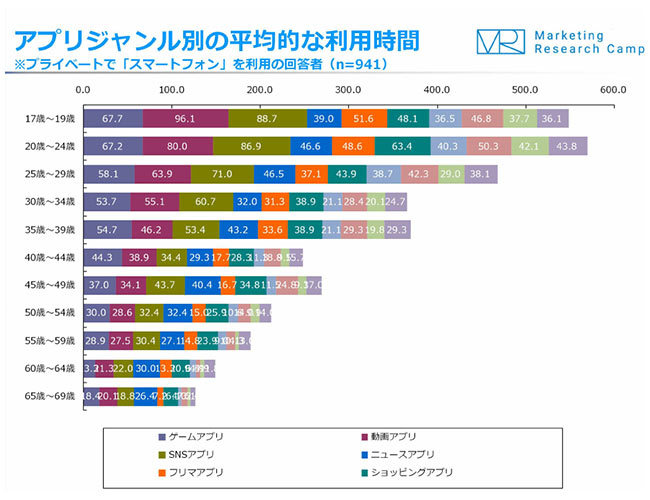 10代に1日平均のスマホアプリ利用時間をジャンルごとに聞いたところ、「動画アプリ」が最も長く平均96.1分、次いで「SNSアプリ」が88.7分、「ゲームアプリ」が67.7分という。男女別では、男性が「動画アプリ」で106.3分と最も長く、女性が「SNSアプリ」で101.5分とのことだ。