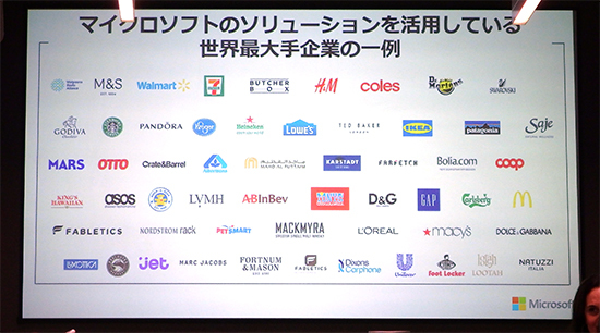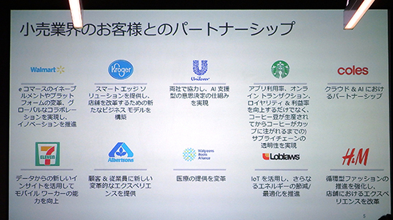 流通分野でMicrosoft Azureを導入する企業の代表としてウォルマートやKroger、ユニリーバ、スターバックス、coles、セブン-イレブン、Albertsons、Walgreens Boots Alliance、Loblaws、H&Mなどを紹介した。
