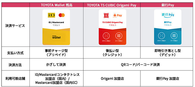 一つのアプリで、プリペイド型電子マネー「TOYOTA Wallet残高」、クレジット型サービス「TOYOTA TS CUBIC Origami Pay」、デビット型サービス「銀行Pay」と3通りの決済方法に対応し、店舗や支払い状況に応じて使い分けられる。