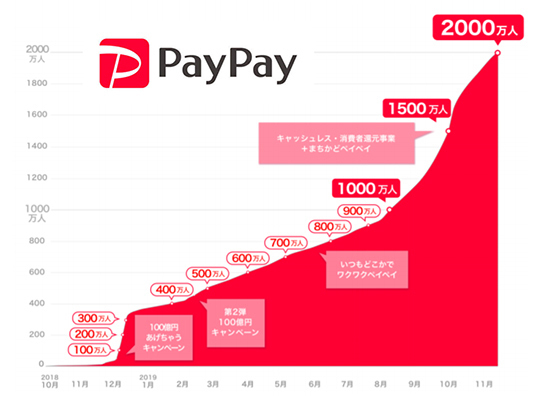11月17日にPayPayの登録ユーザー数が2000万人を突破した。1000万人から1500万人到達にかかった日数は55日だったが、1500万人から2000万人はさらに短い47日。キャッシュレス・消費者還元事業の影響もあり、拡大のペースは加速している。
