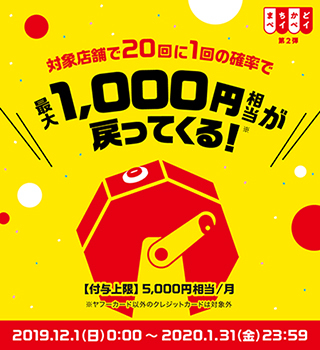 年末に向けたキャンペーンも続々と発表されている。12月1日からは「まちかどペイペイ」の第2弾がスタート。対象となる店舗は第1回と変わらず、キャッシュレス・消費者還元事業の対象で5%還元が適用されている店舗。内容は20回に1回の確率で最大1000円相当のPayPayボーナスが当たるというものに変更されている。付与上限は5000円相当/月。