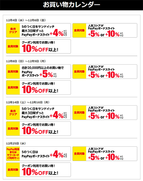 年末感謝セールの期間中は、通常のポイント付与に加えて、対象金額の4%に当たるPayPayボーナスライトを付与する「5のつく日をサンドイッチ」キャンペーンや、対象ストアの決済金額の10%または5%のPayPayボーナスライトを付与する「倍!倍!ストア」キャンペーンなども開催する。