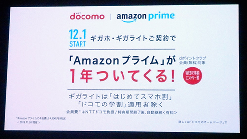 NTTドコモは、同社の携帯料金プランの「ギガホ」を契約するユーザーに、年会費4900円(税込み)するアマゾンの会員制プログラム「Amazon プライム」を1年間利用できる「ドコモのプランについてくる Amazon プライム」を12月1日9時から提供している。