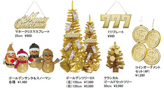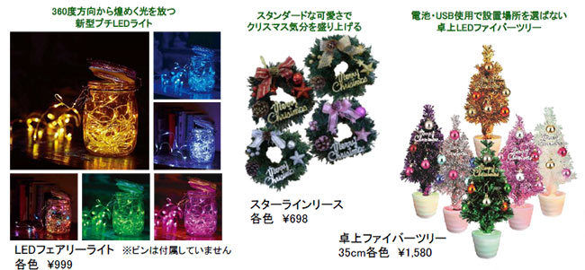 まず、ホームデコレーションは“令和初”を意識したゴールドのグッズを多数用意。ツリーやオーナメントなども金一色で存在感は抜群。スタンダードなものだと、360度に光を放つLEDフェアリーライトや卓上に設置できるLEDファイバーツリーなどがある。