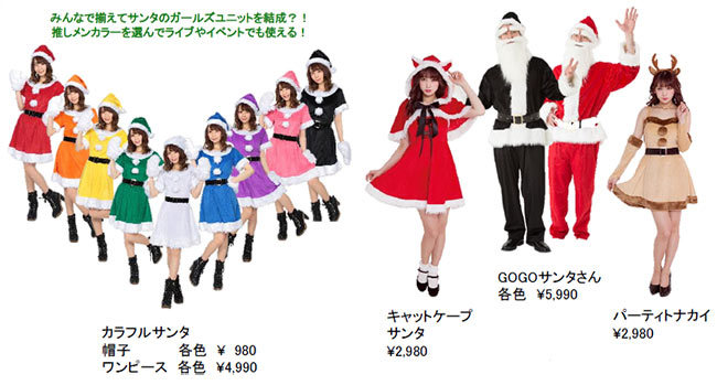 ホームパーティーの定番であるコスチュームも、ドンキならではの品ぞろえ。ワンピースのサンタ衣装は、9色のカラーバリエーションを用意。忘年会の出し物などでも活躍しそうだ。男性向けのサンタ衣装も、赤と黒の2色展開。幅広いニーズに応えてくれそうだ。