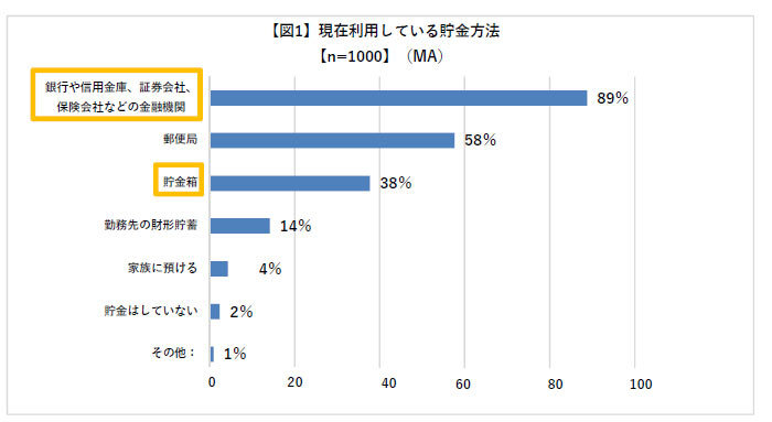 ほかにも、現在使っている貯金方法については、銀行などの金融機関が89%と圧倒的で、続いて郵便局が58%となったが、貯金箱を使っている人も38%いた。大人になっても10人に4人が継続して貯金箱で貯金している。