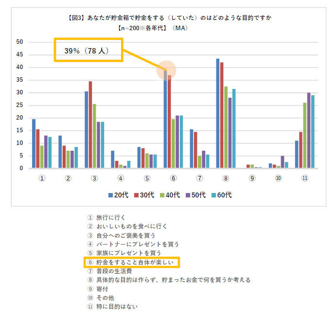 しかも、あえて貯金箱を使ってコツコツ貯金しているのは20~30代の若い人ほど多い結果になった。「貯金箱で貯金をする(していた)目的」を質問したところ、20代の200人中78人の39%が「貯金をすること自体が楽しい」と答え、他の世代よりも突出していることがわかる。